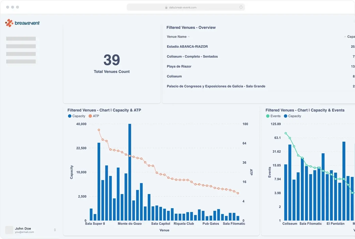 We offer access to the largest concert database in Spain for music industry professionals (and it keeps growing...). We leverage this data to give you the best possible context for your next event.